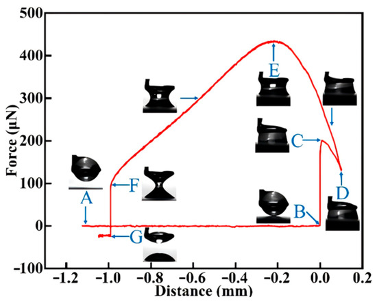 Figure 2 is a curve diagram of the interaction process between a water droplet and a rough coal surface. The entire process was continuously recorded by a CCD camera with a frame rate of 40 fps, capturing the attachment, spreading, compression, stretching, and separation of the water droplet. A micro-syringe was used to suspend a volume of ultrapure water droplet on a Du Noüy ring (with inner and outer diameters of 2.02 mm and 2.32 mm, respectively) connected to a microbalance. Synchronizing the image sequences with the force measurements allowed the determination of the contact angle (θ) and contact radius (r) of the droplet on the coal surface using Image-J software (version 1.8.0). Before measuring the force, the resultant force of the system was set to zero at point A, shown in Figure 2. The relationship between force and position is composed of five distinct steps (Figure 2): (i) The sample stage automatically rises and approaches the droplet without any recorded interaction force (from point A to B). (ii) The droplet adheres to the mineral surface, causing instantaneous spreading of the droplet (from point B to C). (iii) After adhering to the sample surface, the droplet continues to rise for a certain distance (from point C to D). (iv) The sample stage begins to descend, initiating the separation of the droplet from the sample surface (from point D to F), with the maximum adhesion force reached at point E. (v) The droplet detaches from the sample surface (from point F to G).