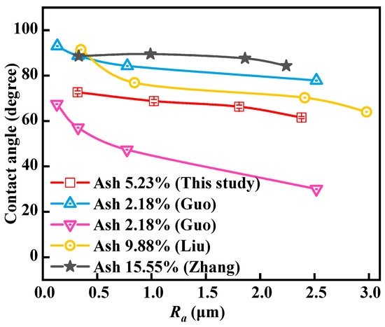 Figure 6 shows the relationship between roughness and contact angle measured by the sessile drop method. As the roughness increases, the contact angle gradually decreases. When the coal surface roughness increases from 0.30 µm to 1.03, 1.89, and 2.39 µm, the contact angle values decrease from 72.6° to 68.8°, 66.3°, and 61.6°, respectively. The measured static contact angle values are between the advancing contact angles (77.84–93.02°) and receding contact angles (29.98–67.45°) measured by Guo et al. [28], indicating that the contact angle measurement results are credible. Compared with the contact angle results measured by Liu et al. and Zhang et al. [17,29] (64.03–91.42° and 84.3–88.6°), the change pattern is basically consistent and the contact angle decreases with the increase of roughness. The variations in contact angle values reported for coal across different literature sources are likely attributable to differences in coal quality. Concurrently, the aforementioned data also suggest that the contact angle measured on coal surfaces does not invariably grow with a decrease in ash content. The contact angle of the coal surface is influenced by a multitude of factors, encompassing the structural morphology and chemical heterogeneity of the coal surface.