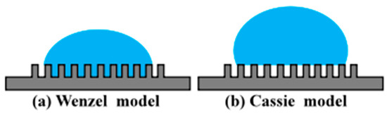 Wettability model for rough surfaces. (a) Wenzel model; (b) Cassie–Baxter model.