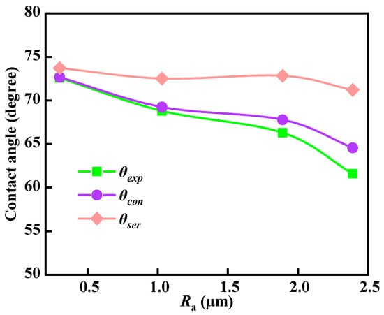 Figure 9 shows the relationship between the contact angles calculated under the two rough structure models and the experimental contact angle (θexp). When the surface roughness is 0.30, 1.03, 1.89, and 2.39 µm, the contact angles of the serrated different rough surfaces (θser) calculated by Formulas (1) and (4) are 72.3°, 71.5°, 70.7°, and 71.5°, respectively. The calculated contact angles largely do not change, which is inconsistent with the actual measurement results. The contact angles of the different convex-concave rough surfaces (θcon) calculated by Formulas (1) and (5) are 71.5°, 68.9°, 65.9°, and 63.9°, respectively. The calculated contact angles decrease with the increase of roughness, which is mostly consistent with the experimental contact angle results (72.6°, 68.8°, 66.3°, and 61.6°), and the calculation error does not exceed 3%. Therefore, it can be considered that the convex-concave type is more in line with the rough surface structure, and this model can accurately predict the contact angle of coal surfaces with different roughness.