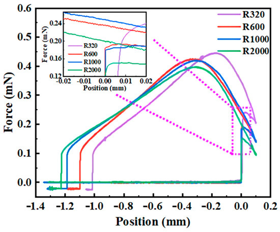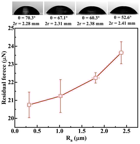 Figure 13 shows the relationship between the residual force of the droplet on the coal surface and roughness. The residual force reflects the size of the droplet volume remaining on the coal surface after the droplet separates from the coal surface. It is obvious that the residual force of the droplet increases with the increase of roughness. As the roughness increases from 0.30 µm to 2.39 µm, the residual force of the droplet increases from 20.74 µN to 23.64 µN. This phenomenon owes its existence to the reality that as the surface roughness increases, droplets adhere more extensively to the coal surface. When the droplet is stretched and begins to separate from the surface, the volume of the liquid bridge reaches the microliter level, at which point the influence of gravity becomes relatively significant. Under these conditions, the weight of the lower part of the liquid bridge exceeds that of the upper part, causing the liquid bridge to rupture more rapidly during the stretching process of the water droplet [35]. Concurrently, the cohesive force of the droplet struggles to overcome the pinning of the contact line, making it difficult to retract the spread droplet. This ultimately results in an increase in the residual volume of the droplet on the surface as roughness increases.