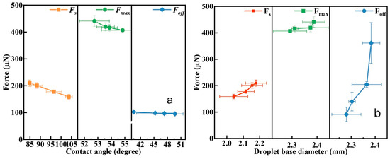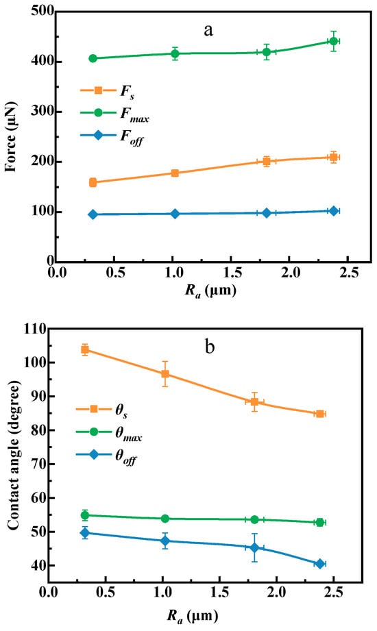 Figure 14a shows the relationship between the spreading force, maximum adhesion force, and detachment force of droplets and the advancing contact angle, most stable contact angle, and receding contact angle. The smaller the contact angle, the greater the corresponding droplet–coal interaction force. At the spreading point, when the contact angle decreases from 103.8° (Ra = 0.30 µm) to 84.8° (Ra = 2.39 µm), the spreading force increases from 159.00 µN to 209.60 µN. At the maximum adhesion force point, when the contact angle decreases from 54.8° (Ra = 0.30 µm) to 52.7° (Ra = 2.39 µm), the maximum adhesion force increases from 406.76 µN to 441.08 µN. At the detachment point, when the contact angle decreases from 49.7° (Ra = 0.30 µm) to 40.5° (Ra = 2.39 µm), the detachment force increases from 95.37 µN to 102.39 µN.