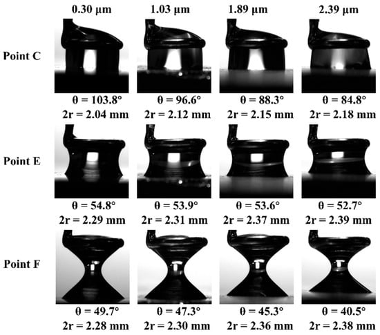 As shown in Figure 11b, the advancing contact angle (measured at point C), the most stable contact angle (measured at point E), and the receding contact angle (measured at point F) decrease with the increase of roughness, which is consistent with the contact angle measurement results. As the roughness increases from 0.30 µm to 1.03, 1.82, and 2.39 µm, the advancing contact angle decreases from 103.8° to 96.6°, 88.3°, and 84.8°, the most stable contact angle decreases from 54.8° to 53.9°, 53.6°, and 52.7°, and the receding contact angle decreases from 49.7° to 47.3°, 45.3°, and 40.5°.
