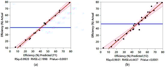 Correlation plots of the actual versus predicted adsorption efficiency Y1 by FFD (a) and predicted adsorption efficiency Y2 by CCD (b), where RSq—the square of the Pearson correlation coefficient or coefficient of determination (R2), RMSE—the Root Mean Squared Error, and p Value—probability value (or p-value).