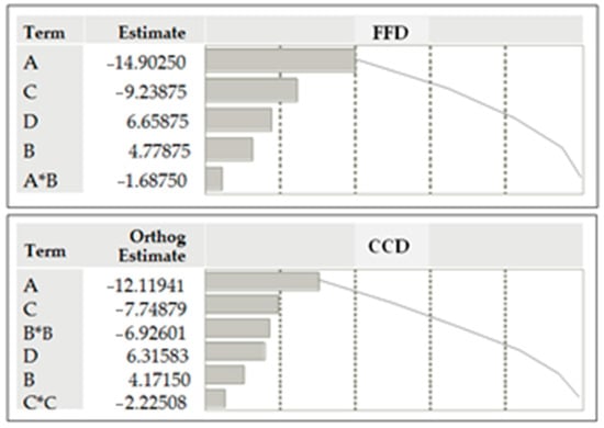 For easier visualization, a graphical presentation (Pareto diagrams) of the standardized factors effects and their statistically significant interactions obtained using 24 FFD and CCD is shown in Figure 2. The Pareto plot in both cases shows that the main effects (A, B, C, and D) are significant at the 5% significance level (Table 3). Based on the FFD, it was estimated that the A*B interaction is significant. Also, through CCD, the influence of squares B2 and C2 was assessed as significant at the 5% significance level.