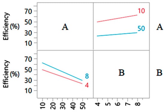 However, comparative tests of the effects of main factors and their interactions using FFD and CCD (Table 4) indicated one characteristic case of lack of fit. Namely, the A*B linear interaction was estimated to be significant (p < 0.05) model term using FFD. To understand the interaction nature, the A*B factor interaction is represented by the interaction graph in Figure 3. The presence of non-parallel lines within the design limits indicated the significance of the A*B interaction. In contrast, based on the F-ratio (1.8983 < 4) and Prob > F (0.1915), the CCD did not evaluate this model term as a statistically significant factor interaction (p > 0.05). Therefore, this interaction was excluded from the analysis based on the CCD methodology, and the presented second-order polynomial model by CCD (Equation (4)) was adopted as adequate to describe the factors effect on the response and predict the adsorption efficiency.