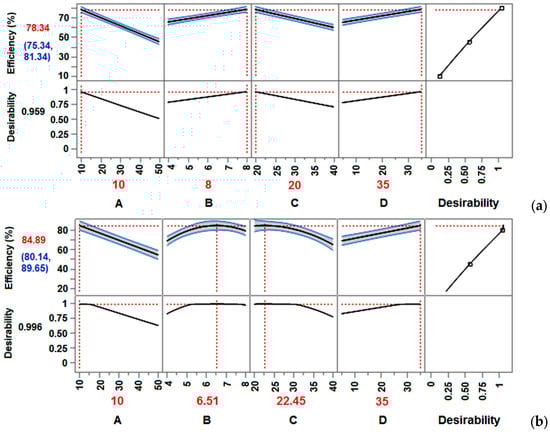 Further, both design types similarly predicted a positive effect of contact time (factor D) on nitrate adsorption efficiency (Figure 4). Thus, the high adsorption efficiency (80–90%) with a linear effect of time indicates a stable and efficient process within the designed limits (from 5 to 35 min). However, this prediction did not meet our expectations at first glance. This leads to the suspicion that additional testing (longer contact time) is necessary to achieve process equilibrium. According to some literature data on nitrate adsorption by similar lignocellulosic biomasses [15,26], the equilibrium state is reached at similar reaction conditions within 30–40 min, depending on the initial solution concentration. Additionally, the nitrate adsorption process occurs in two phases [26]. The first phase (initial period) is characterized by rapid nitrate adsorption (whereby most of the nitrate is removed), while the second phase is slower due to the adsorbent surface saturation (achieving equilibrium). Therefore, a linear effect of time was expected with a maximum that should appear in the adsorption saturation phase within 35 min. The possible misconception can be clarified by a more careful analysis of the desirability function using CCD (Figure 4b), which once again confirmed the advantage of this methodology. Following the ANOVA analysis, the desirability function was used to optimize multiple output variables (responses), where each response was transformed onto a scale ranging from 0 (completely unacceptable result) to 1 (most desirable result). All individual desirability scores were combined into an overall desirability function, which was used to identify the combination of factors that provide the best overall outcome. By incorporating constraints and targets for each response, the optimal factor levels that yield the best combination of values for all responses were estimated. In this sense, as can be seen from Figure 4b, the desirability has reached its ideal state at 25 min. From that moment the desirability does not change anymore but stagnates at 0.996 because the goal has been achieved. Although the adsorption efficiency continues to increase linearly, it can be assumed that it is no longer significant in relation to the resources needed for additional investments. The CCD model estimated a time of 35 min as optimal because it does not seek the ideal value of the isolated factor D but is based on the combination of all factors that give the best efficiency and desirability function. In general, it can be concluded that the optimal time is 25–30 min.
