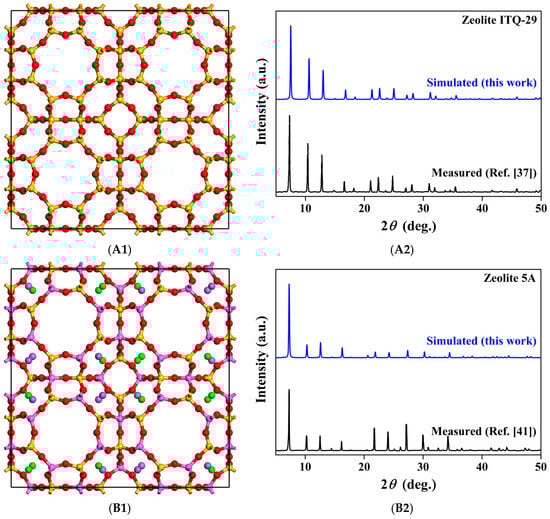 Structural models and X-ray diffraction patterns of the zeolites ITQ-29 (A1,A2) and 5A (B1,B2). Spheres: yellow (Si), red (O), pink (Al), purple (Na), and green (Ca). The lattice parameters for zeolite ITQ-29 are a = b = c = 23.70 Å, and for zeolite 5A, a = b = c = 24.84 Å. The chemical formula of the structural model for zeolite ITQ-29 is Si192O384, and that for zeolite 5A is Ca32Na32Si96Al96O384.