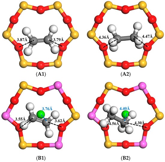 Adsorption structures of C2H4 and C2H6 molecules in zeolites ITQ-29 (A1,A2) and 5A (B1,B2). Spheres: yellow (Si), red (O), pink (Al), green (Ca), gray (C), and white (H). Only the 6-membered rings near the adsorbate molecules in the zeolite cells are shown in the figure, and the distances between each C atom of the molecules and its proximal O atom in host 6-membered ring of zeolite ITQ-29 or 5A and the minimal distances between C and Ca atoms in zeolite 5A are shown.