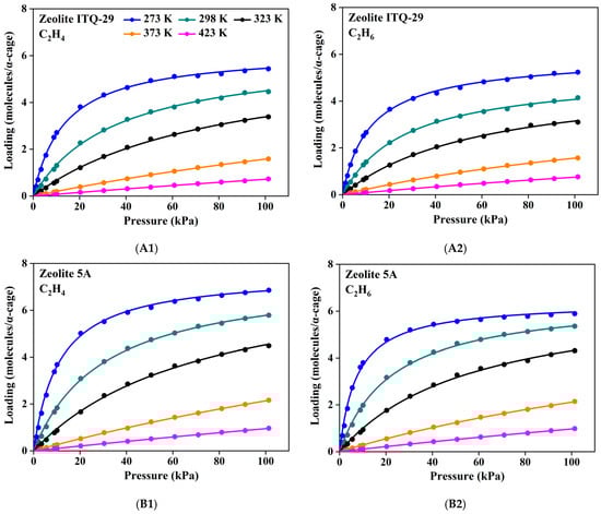 The single-component isotherms of C2H4 and C2H6 adsorption in zeolites ITQ-29 and 5A at different temperatures are shown in Figure 3 and the Langmuir model [49] provides excellent agreement with the adsorption data (Table S8, adj.−R2 > 0.999). As the temperature increases, both loadings of C2H4 and C2H6 in the zeolites decrease sharply, and the loading differences between C2H4 and C2H6 also decrease, which indicates that a low temperature is favorable for the adsorptive separation of C2H4 and C2H6. As pressure increases, both loadings of C2H4 and C2H6 in the zeolites increase rapidly at low pressures owing to abundant adsorption sites, while the loadings approach asymptote at high pressures due to the progressive saturation of adsorption sites. Moreover, the loadings in zeolite 5A are higher than in zeolite ITQ-29. This difference is attributed to their distinct chemical compositions. Zeolite 5A contains Ca2+ and Na+ cations, which enhance the adsorbent–adsorbate interactions through intensifying electrostatic interactions. In contrast, pure silica zeolite ITQ-29 lacks such cations, leading to weaker interactions dominated by van der Waals forces. This indicates that the exchangeable cations play a pivotal role in enhancing adsorption loadings in the zeolite.