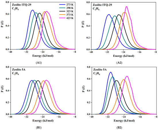 Energy distribution profiles for C2H4 and C2H6 adsorption in zeolites ITQ-29 (A1,A2) and 5A (B1,B2) under 101 kPa at different temperatures. The y-axis represents the probability density, P (E) (a.u.), which is normalized to unity. More negative energies represent stronger adsorbent–adsorbate interactions.
