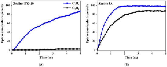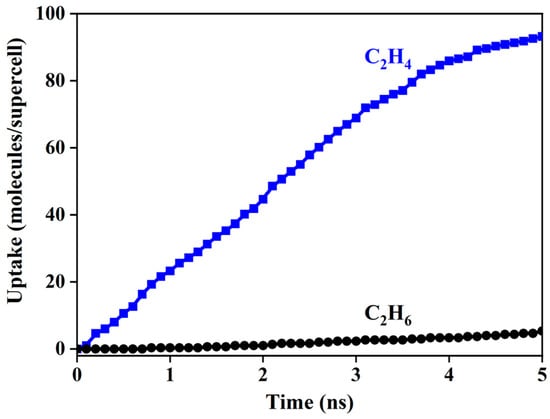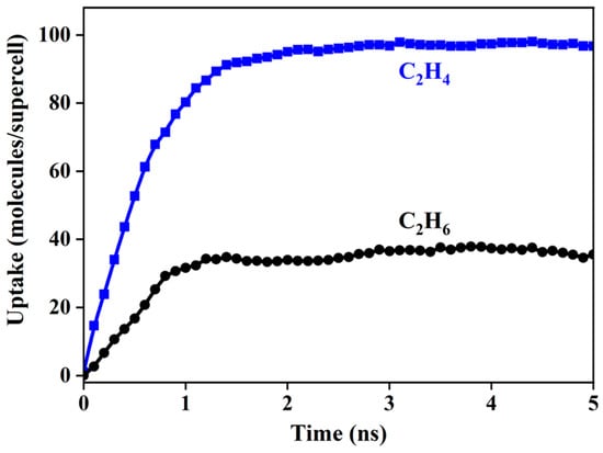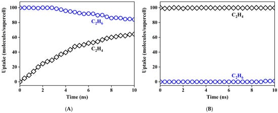 In displacement adsorption, the uptakes of C2H4 and C2H6 in zeolite 5A are shown in Figure 8. When C2H6 molecules are pre-adsorbed in the zeolite, the C2H4 molecules in the gas reservoir rapidly enter the zeolite and displace the pre-adsorbed C2H6 molecules. At 6 ns, 63% of pre-adsorbed C2H6 molecules are displaced by C2H4 molecules, and then the system achieves dynamic equilibrium, as shown in Figure 8A. In reverse, when the C2H4 molecules are pre-adsorbed, the C2H6 uptake increases gradually and stabilizes at 38 molecules per supercell, as shown in Figure 8B, where the C2H6 molecules adsorb on the vacant sites left after C2H4 adsorption while not displacing the pre-adsorbed C2H4 molecules. Moreover, there is no significant C2H4 desorption into the gas reservoir, indicating its stronger affinity for the zeolite as discussed in the adsorption energy calculations and mixture adsorption. The displacement adsorption phenomenon was also observed in experimental measurements [53,54].