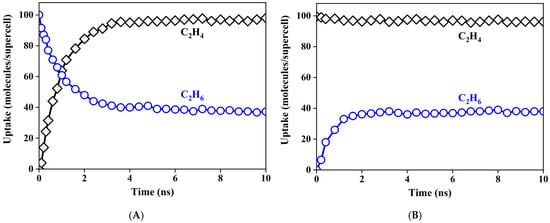 Uptakes of C2H4 and C2H6 in zeolite 5A with 50% coverage of MPA during displacement adsorption at 298 K. In the simulation, initially there are 100 C2H6 molecules in the slab and 100 C2H4 molecules in the gas reservoir (A) or 100 C2H4 molecules in the slab and 100 C2H6 molecules in the gas reservoir (B) before the adsorption starts.
