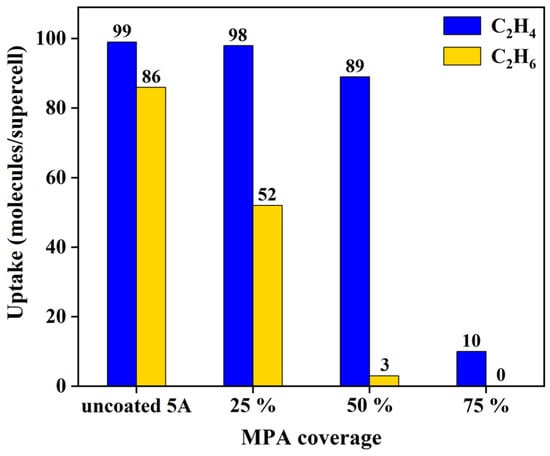 In displacement adsorption, the uptakes of C2H4 and C2H6 in zeolite 5A with 50% coverage of MPA are shown in Figure 11. When C2H6 molecules are pre-adsorbed in the zeolite, the C2H4 molecules in the gas reservoir displace the pre-adsorbed C2H6 molecules progressively although the process is slow compared with that in uncoated zeolite 5A, in which the displacement has not completed even after 10 ns (Figure 11A). In reverse, when the C2H4 molecules are pre-adsorbed, the MPA coating effectively excludes the C2H6 molecules; the C2H4 uptake does not change throughout the simulation, demonstrating that the MPA coating prevents the C2H4 molecules from escaping the solid slab (Figure 11B). This indicates that the MPA coating tunes the molecular diffusion rate across the coating layer while preserving the competitiveness of C2H4 over C2H6 on the adsorption sites, enabling the small molecules to preferentially permeate [55].