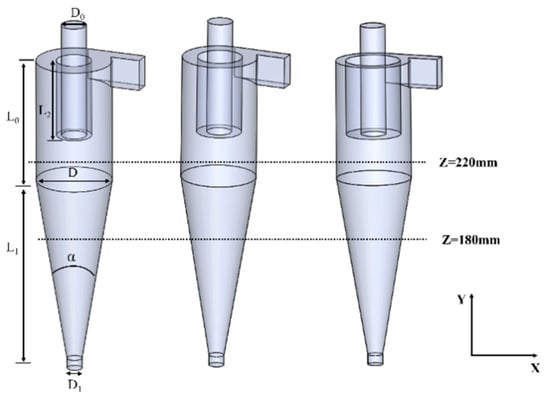 Hydrocyclones have been widely applied in industries such as petroleum and chemical engineering due to their structural simplicity, small footprint, and absence of moving parts. A typical hydrocyclone consists of five major components: inlet section, cylindrical section, conical section, vortex finder, and spigot [1,2,3]. When multiphase flow enters the hydrocyclone under the high pressure induced by a plunger pump, particle classification occurs under the combined action of centrifugal force, pressure gradient force, and other classification forces. The classification process can be described as follows: coarse particles migrate toward the wall under centrifugal force and are discharged through the spigot, achieving axial settling; meanwhile, fine particles migrate toward the center under the pressure gradient and are discharged through the overflow outlet, completing radial settling under the guidance of the vortex finder. The ideal classification scenario involves all coarse particles exiting through the spigot and all fine particles being collected at the overflow outlet. However, due to inherent structural limitations and the influence of intense turbulent fluctuations, the internal flow field of the hydrocyclone becomes highly complex. Phenomena such as short-circuit flow, circulating flow, and secondary flow coexist, leading to particle trajectory deviations and a significant degree of particle misplacement—one of the main reasons for the low classification sharpness of hydrocyclones. As the discharge channel for fine particles, the vortex finder plays a crucial role in determining the classification performance. Therefore, rational design of the vortex finder geometry is considered one of the key strategies to enhance hydrocyclone classification efficiency [4,5].
