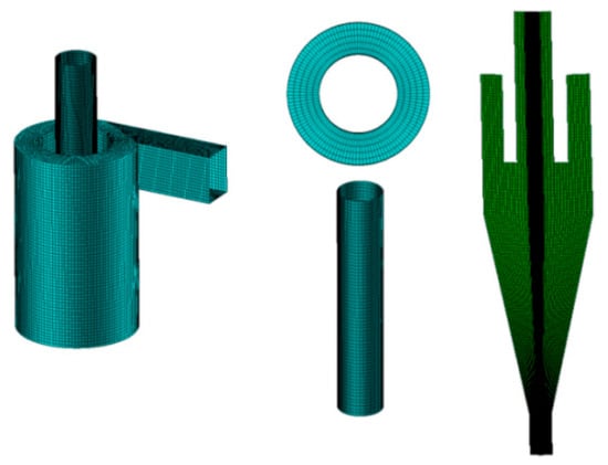 To investigate the influence of vortex finder wall thickness on the internal flow field and classification performance of the hydrocyclone, numerical simulations were carried out for three vortex finder structures with wall thicknesses of 5 mm, 10 mm, and 15 mm. The structure and dimensions of the hydrocyclone are shown in Figure 1 and Table 1. Except for the vortex finder wall thickness, all other structural parameters remained identical. Mesh generation is one of the most critical steps in numerical simulation, as the type, number, and size of the mesh significantly affect numerical accuracy. Among various mesh types, hexahedral meshes are widely used for geometrically regular structures due to their high accuracy and fast convergence [20,21]. Therefore, in this study, an O-grid meshing method was used in Integrated Computer Engineering and Manufacturing (ICEM 2023) software to generate a hexahedral mesh, as shown in Figure 2. To select an appropriate mesh number and ensure reasonable computation time, a mesh independence test was conducted, as illustrated in Figure 3. Tangential velocity was used as the evaluation criterion. When the mesh count reached 2.6 × 105, the tangential velocity showed minimal variation with further increases in mesh number. Therefore, to optimize computational efficiency, a mesh with 3.1 × 105 hexahedral cells was adopted for the computational domain. Since this study focuses on the vortex finder, mesh refinement was applied near the wall and wall thickness of the vortex finder. Additionally, to reduce numerical diffusion during the computation, the hydrocyclone was axially divided into segments every 30 mm for mesh partitioning and then reassembled to improve the accuracy of the simulation results [22,23,24].