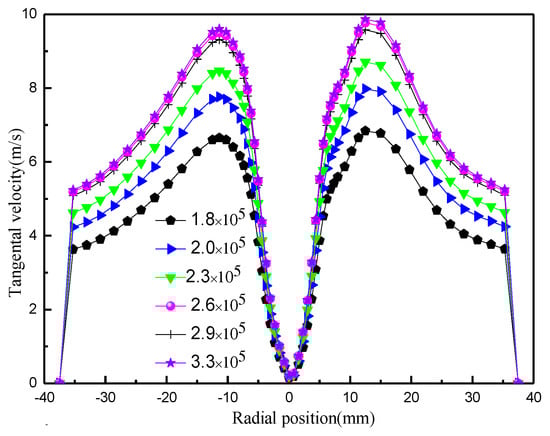Figure 9 shows the effect of vortex finder wall thickness on radial velocity. The radial velocity profile exhibits an antisymmetric pattern about the centerline, likely caused by the compression of the air core by the surrounding fluid. As the vortex finder wall thickness increases, the distinct features of the radial velocity distribution become more pronounced, indicating that a thicker-walled vortex finder enhances the stability of the internal flow field.