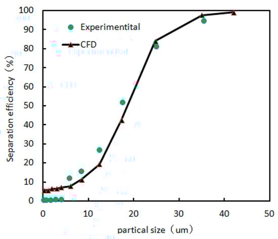 The particle phase motion characteristics were predicted using the Two-Fluid Model (TFM), and the resulting simulated data were compared with Delgadillo’s [35] experimental data. As illustrated in Figure 5, the simulated and experimental values exhibit a high degree of consistency, with only minor discrepancies observed for particles smaller than 5 µm. This phenomenon may be attributed to two factors: first, errors associated with the particle size analyzer; second, the high wettability of particles smaller than 5 µm, which hinders the hydrocyclone’s ability to effectively classify them, resulting in an experimental measurement of zero. When particle sizes exceed 5 µm, the variations in simulated and experimental values are highly consistent, demonstrating that the TFM can accurately predict the particle phase motion characteristics. In summary, the simulated data obtained from the physical model utilized in this study are reliable.