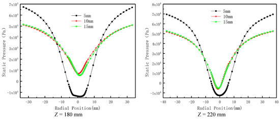 A hydrocyclone converts pressure energy into kinetic energy with concomitant energy loss; hence, investigating the distribution and variation of static pressure within the hydrocyclone is of significant practical importance. Figure 6 shows the effect of vortex finder wall thickness on static pressure along the diameters at Z = 180 mm and Z = 220 mm. The static pressure decreases radially inward before increasing near the center, where it becomes negative. This negative pressure arises from the conversion of pressure energy to kinetic energy during circumferential motion; when pressure falls below ambient, external air is drawn into the hydrocyclone center, forming the air core. As vortex finder wall thickness increases, the static pressure magnitude decreases, indicating that a thicker wall effectively reduces internal energy consumption under identical operating conditions, thereby lowering operational costs. Moreover, the thicker wall diminishes the likelihood of vortex formation and enhances flow field stability while maintaining adequate particle classification.