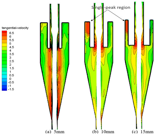 Tangential velocity is one of the most critical components of the velocity field in a hydrocyclone. It directly influences the centrifugal force and, consequently, the classification performance of the hydrocyclone. At the same time, it serves as the primary driving force for the radial settling of particles. Although a high tangential velocity can effectively enhance the centrifugal force acting on particles, it also increases the likelihood of generating tangential vortices, which can lead to flow field instability. Therefore, a reasonable tangential velocity not only promotes particle classification but also contributes to flow stability. The influence of vortex finder wall thickness on tangential velocity in the ZX plane is shown in Figure 7. The white region at the center corresponds to the air core. It can be observed that the tangential velocity is lowest at the wall and gradually increases toward the center, reaching a maximum at a location close to the axis. As the wall thickness of the vortex finder increases, more fluid is compressed toward the outer wall of the hydrocyclone, resulting in a “narrow throat effect”, which significantly increases the kinetic energy of the fluid and introduces asymmetry in the velocity distribution.