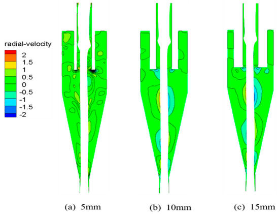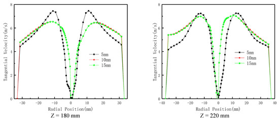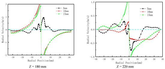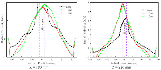 To elucidate the microscopic effect of vortex finder wall thickness on radial velocity, radial velocity profiles along diameters at Z = 180 mm and Z = 220 mm are presented in Figure 10. In the conical section (Z = 180 mm), radial velocity is observed to increase with wall thickness, as more energy is apportioned to this region by the thick-walled vortex finder. In the cylindrical section (Z = 220 mm), the radial velocity at 5 mm wall thickness exceeds that at 10 mm, since the slight increase in wall thickness augments internal confluent flow, thereby attenuating radial velocity. When the wall thickness reaches 15 mm, radial velocity rises sharply, indicating that a critical wall thickness threshold has been surpassed. Higher tangential velocities not only mitigate misaligned particle entrainment but also accelerate lateral particle settling, reducing the likelihood of radial vortices and thus enhancing particle classification.