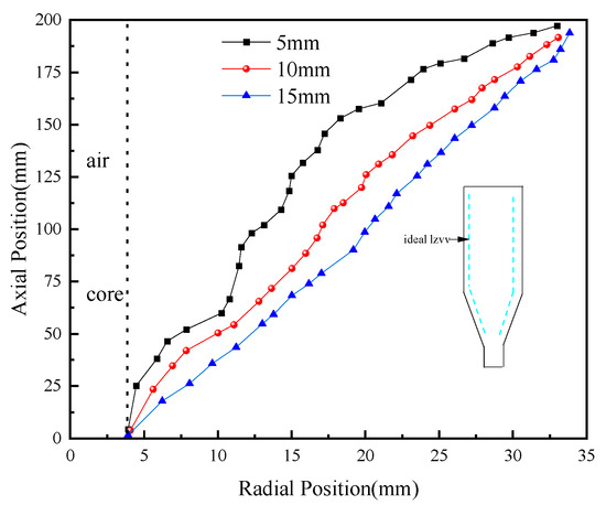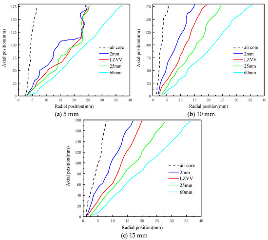 When the direction of axial velocity reverses, points at which the velocity is zero inevitably occur; connecting these points yields the zero-velocity envelope surface (LZVV). The LZVV is a key indicator of hydrocyclone separation efficiency (η = Cu/Cf × 100%) and delineates the inner fine-particle separation zone from the outer coarse-particle zone. Figure 14 shows the effect of vortex finder wall thickness on the LZVV. As wall thickness increases, the LZVV shifts outward, indicating an enlarged fine-particle separation region and more complete fine-particle separation. Ideally, the LZVV should closely follow the hydrocyclone’s outer wall profile; the 10 mm and 15 mm configurations exhibit LZVV shapes in the conical section that closely match the outer wall, whereas the 5 mm configuration shows poor gradient smoothness, which may cause irregular variations in the fine-particle separation space and adversely affect precise fine-particle separation.