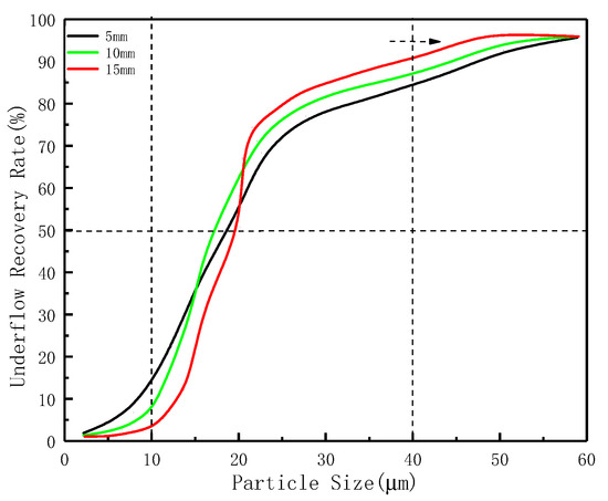 As shown in Table 6 and Table 7, the vortex finder wall thickness affected particle size distribution. In the underflow, the 15 mm thick-walled vortex finder reduced the content of <19 μm particles by 32.17% compared to the 5 mm configuration. In the overflow, the content of <19 μm particles increased by 12.72% relative to the 5 mm design. These results indicate that underflow contamination by fines was effectively mitigated and separation sharpness was significantly improved, thereby addressing low concentrate grade and poor separation efficiency.