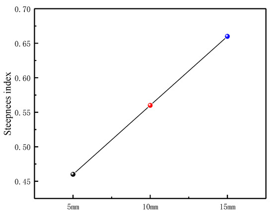 The partition curve is a key performance index for hydrocyclone separation efficiency (η = Cu/Cf × 100%), reflecting the recovery rate of particles of different sizes in the underflow. Figure 16 shows the effect of vortex finder wall thickness on the partition curve. Underflow recovery increases with particle size. To distinguish coarse particle and fine particle separation performance, the curve is divided into fine and coarse regions. In the fine region, increased wall thickness reduces fine-particle carryover in the underflow, effectively mitigating underflow contamination. In the coarse region, thick-walled vortex finders yield higher coarse-particle recovery than thin-walled ones, enhancing coarse product yield. To assess the impact on cut size and separation sharpness, Figure 17 presents the variation of cut size (d50), defined as the particle size corresponding to 50% underflow recovery. A smaller d50 indicates stronger separation capability. Figure 18 shows the steepness index (d25/d75), representing the slope at 50% recovery; higher values indicate better separation sharpness and product quality.