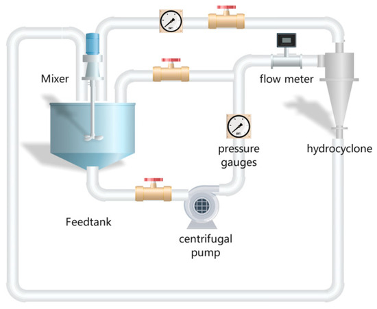 To evaluate the influence of thick-walled vortex finders on hydrocyclone separation performance, an experimental campaign was conducted. The test rig comprised a feed system (slurry pump and hopper), measurement system (flowmeter and pressure gauge), control system (valve), classification system (hydrocyclone), and recirculation piping. First, solids and water were mixed in the hopper at a predetermined ratio under stirring to maintain a uniform slurry concentration. The slurry was then delivered to the hydrocyclone inlet by the slurry pump, with volumetric flow rate adjusted via a frequency converter. Inlet flow rate and pressure were continuously monitored by the flowmeter and pressure gauge, respectively; any blockage was relieved by valve actuation to protect the hydrocyclone. Overflow and underflow outlets were piped back to the hopper to enable closed-loop operation (Figure 20). Prior to testing, the pump was run with water to check for leaks under high pressure and to flush residual printing debris from the hydrocyclone. Once proper operation was confirmed, slurry at the target concentration was prepared and stirred uniformly before performance tests commenced. To minimize experimental error, multiple parallel samples of feed, overflow, and underflow were collected, analyzed, and averaged to ensure data accuracy.
