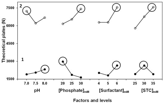 The mean graph obtained from the analysis of the results, for both electrolytes, is presented in Figure 2. Considering that the aim is to maximize efficiency in electrophoretic separation, the conditions that provided the highest value in response variable (N) for the SDS-STC electrolyte are [Phosphate] = 20.0 mM, [SDS] = 6.0 mM and [STC] 30.0 mM adjusted to a pH value of 8.0, while for the SLES-STC electrolyte it is required to establish a working pH equal to 7.0, [Phosphate] = 30.0 mM, [SLES] = 6.0 mM and [STC] 35.0 mM.