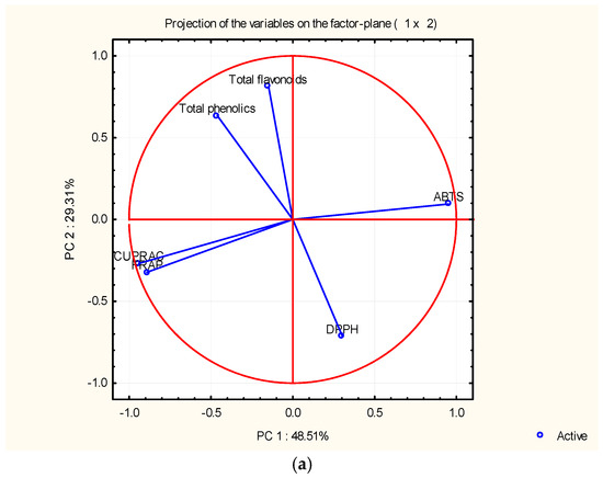 The results of the PCA are presented in Figure 2. The variability described by PC1 mostly correlated with ABTS free radical scavenging and the cupric and ferric reducing capacities of extracts. CUPRAC and FRAP are strongly positively correlated, while ABTS is found in opposition to CUPRAC and FRAP. PC2 was correlated with total flavonoids and the phenolic content, as well as with the DPPH radical scavenging activity (Figure 2a).