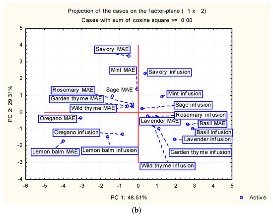 Principal component analysis. Projection of the (a) examined variables—antioxidant activity parameters, total phenolics, and flavonoid content, and (b) cases—herbal extracts in the space defined by PC1 and PC2.