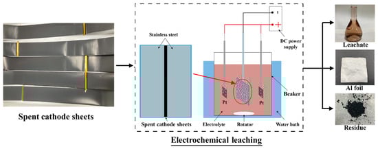 Electrochemical recycling presents a transformative approach for spent LIBs, especially driven by green electricity [20,21,22]. The electrochemical method can promote the separation of CMs and Al foils by generating hydrogen on the surface of Al foil through an external electric field, which is non-destructive to the structure of organic binders [23]. Moreover, high-valence transition metals in the CM can be reduced by obtaining electrons at the cathode. Therefore, electrolysis in acid solution can achieve efficient leaching of the CM [24,25]. However, the current research on electrochemical methods only focuses on the separation of CMs from Al foils or the dissolution of valuable metals from CMs. In fact, when spent CSs are used as the cathode in an electrochemical leaching process, hydrogen will inevitably be generated, and the cathode material will be separated from the Al foil prematurely, leading to the failure of the full reduction of the CMs, resulting in a reduction in the leaching efficiency of valuable metals. Therefore, how to effectively apply electrochemical methods to recycle spent LIBs is of great research significance.