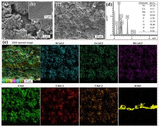 The spatial architecture of spent CSs was first investigated through morphological and elemental distribution analyses of their surfaces and cross-sections. As shown in Figure 2a, spherical CM particles are observed on the surface, interconnected by abundant organic binders within particle gaps. These binders ensure robust particle agglomeration, resulting in an exceptionally smooth and compact surface (Figure 2b). Cross-sectional analysis (Figure 2c–e) reveals a distinct sandwich structure: an Al foil core flanked by composite layers consisting of CM particles, binders, and conductive additives. EDS semi-quantitative analysis (Figure 2d) of the cross-section confirms the substantial presence of valuable metals, with Ni, Co, Mn, and Al collectively accounting for 63.62% of the total mass. Non-metallic components include fluorine (4.78%) and carbon (12.39%), primarily attributed to organic binders and conductive additives. EDS mapping (Figure 2e) demonstrates spatial overlap of Ni, Co, Mn, and O elements, confirming their exclusive origin from CM particles. Carbon signals primarily derive from the binder’s carbon backbone and conductive carbon black (CB), while fluorine originates from polyvinylidene difluoride (PVDF) binders and residual LiF electrolyte traces. Minor phosphorus content suggests a residual electrolyte on the surface, and the isolated Al distribution corresponds to the current collector foil. Therefore, the spatial structure of the spent CS was obtained, that is, a sandwich structure composed of the CS, PVDF and CB on both sides of the Al foil. This multi-layered structure hinders the effective recovery of valuable metals by traditional methods, which have complex procedures that often require the removal of binders and the physical separation of CMs from Al foil by crushing and screening.