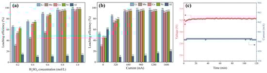 The effects of the H2SO4 concentration (0.2–1.0 mol/L) and applied current (320–1600 mA) on electrochemical leaching performance were investigated. As shown in Figure 3a, at a constant current of 960 mA, leaching efficiencies of Li, Mn, Ni, and Co increased progressively with the H2SO4 concentration: from 65%, 30%, 54%, and 62% at 0.2 mol/L to 97%, 93%, 94%, and 95% at 0.8 mol/L, respectively. This significant enhancement in metal dissolution is attributed to two factors: (1) H2SO4 acts as an electrolyte, where higher concentrations improve mass transfer within the electrolytic cell; and (2) increased acidity promotes the dissolution of valuable metals following electrochemical reduction. Further increases to 1.0 mol/L yielded only marginal efficiency gains. Notably, Al dissolution remained at 10% to 14% across all concentrations, indicating effective cathodic protection. Consequently, 0.8 mol/L was identified as the optimal H2SO4 concentration.