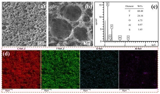 A comparative evaluation of Al foil surfaces obtained through different processing methods reveals critical advantages of the electrochemical approach (Figure 7). Organic solvent (NMP) treatment effectively removes bulk CM particles from the Al foil surface (Figure 7a,b), yet fails to eliminate particles deeply embedded within the Al matrix, compromising Al foil purity. In contrast, electrochemical leaching produces Al foil surfaces with minimal CM particle residue and distinct micro-corrosion pores (Figure 7c,d). This phenomenon is caused by the separation of CM from Al foil enhanced by hydrogen evolution and Al foil dissolution during electrochemical leaching, which removes CM particles adhered to the surface of Al foil, and finally obtains high-purity Al foils.
