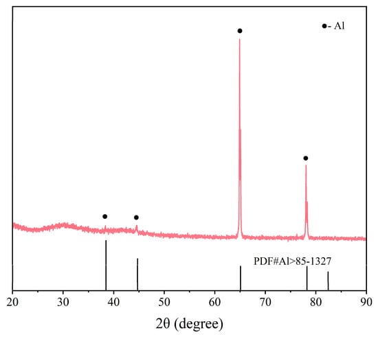 XRD phase analysis of the Al foil recovered through electrochemical separation (Figure 8) revealed its phase composition, with characteristic peaks detected at 38.5°, 44.8°, 65.2°, and 78.3° within the 20–90° scanning range. These diffraction patterns align precisely with the standard PDF card for elemental Al, while the absence of detectable impurity phases demonstrates the effectiveness of the electrochemical process in preserving Al integrity. In addition, the purity of the recovered Al foil reaches 99.2% through ICP measurement. The clean spectral profile not only validates the foil’s structural fidelity but also highlights the method’s capability to achieve material recovery without introducing secondary contaminants.
