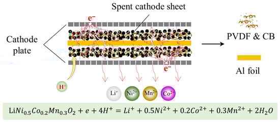 The cathode material (CM) particles are firmly attached to the Al foil by organic binders, making them difficult to separate effectively [5,6]. At present, the common methods to separate CMs from Al foils are mainly solvent and heat treatment methods. The solvent method often uses organic solvents such as N-Methyl-2-Pyrrolidone (NMP) to dissolve organic binders so as to achieve the separation of CMs and Al foils [7,8]. However, this method consumes a large amount of toxic organic agents and poses potential secondary pollution. As for the heat treatment process, organic binders are decomposed into gases by controlling the temperature, which can realize the effective separation of CMs and Al foils [9,10,11]. Although heat treatment can achieve the separation of CMs from the Al foil, the treatment of toxic release gases is still a major challenge. Moreover, due to the high-valence transition metals that exist in the CM, CM shows a poor leaching efficiency in acidic solutions without reduction [12]. In order to improve the leaching efficiency, a certain amount of reducing agents such as explosive H2O2 [13,14] are generally added in the hydrometallurgical process to reduce the high-valence metals, or reducing substances such as graphite [15,16], coke [17] and biomass [18,19] are used for mixed heat treatment to reduce the high-valence transition metals before acid leaching. However, these conventional processes usually cause high reagent consumption, high energy consumption, and potential environmental pollution. Therefore, there is an urgent need for a green and effective way to recover valuable metals from spent LIBs.