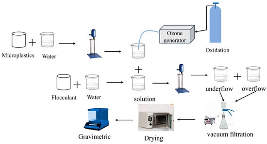The experiment was carried out in a beaker, as shown in Figure 1. The microplastic concentration used in each experiment was 10 ppm [31,32], and the volume of the solution was 500 mL. The coagulation test was performed by rapid stirring for 1 min, followed by slow stirring for 5–10 min, and then the solution was left to stand for 30 min [33]. An unspecified ozone flux of 20 mg/min was applied, where ozone was introduced to the water in the form of bubbles, accompanied by stirring. A 20% aluminum sulfate aqueous solution and a 5 ‰ PAM solution were used in the experiment [34]. At the end of the experiment, the microplastics floating in the solution were collected, filtered, dried, and weighed. The operation was repeated twice to obtain the average value.