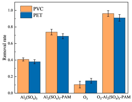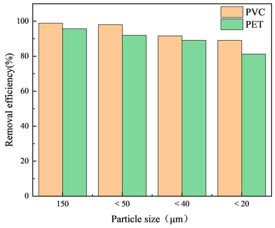 This study investigated the influence of microplastic particle size on the removal efficiency. The results show (Figure 6) that particle size affected the removal efficiency of microplastics. The removal efficiencies of both PVC and PET microplastics showed a downward trend with decreases in the particle size. The removal efficiency of microplastics with a large particle size (>40 µm) was stable above 90%, while the surface charge density of microplastics with a small particle size increased [37]. Therefore, more Al3+ is needed to complete the charge, which will hinder the entrapment of flocs.