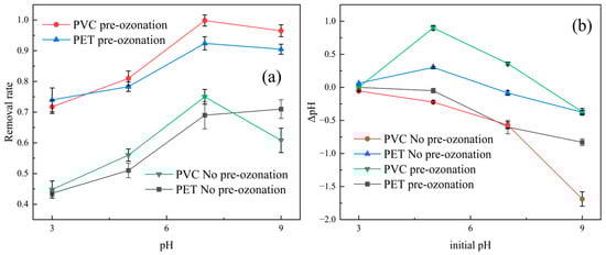 Effects of pH on removal rate of PVC and PET microplastics (a), changes in pH of solution (b).