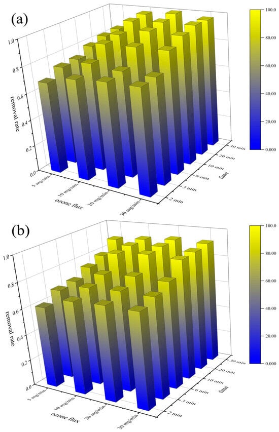 The removal rates of both PVC and PET increased from 76.91% to 99.84% and from 71.31% to 92.40% when the ozonized time increased from 2 min to 30 min, respectively. As shown in Figure 4a,b, although the removal rates of PVC and PET showed a tendency to increase with increasing ozone flux, the removal rates of PVC and PET were already relatively high when the ozone flux was 15 mg/min, and further increases in ozone flux had a negligible effect on microplastic removal.