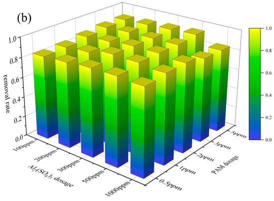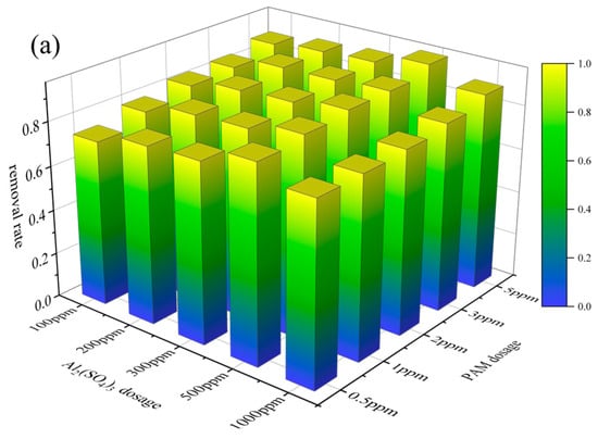 The effect of flocculation dosage was further investigated (see Figure 5). It was found that the effect of a 20% Al2(SO4)3 solution dosage was similar to the results of flocculation alone. As shown in Figure 5, the removal rate of microplastics increased with increases in PAM dosage at a constant dosage of Al2(SO4)3. When the 5‰ PAM solution dosage was 1 ppm, the removal rates of PVC and PET in the O3_coagulation system of Al2(SO4)3/PAM reached the maximum values of 96.23% and 91%, respectively. As shown in Figure 5, the effects of Al2(SO4)3 and PAM dosage on microplastic removal are similar.