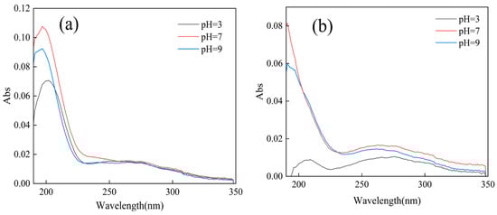 As shown in Figure 9, the UV-VIS absorption spectrum of the water showed an absorption peak of the carbonyl group near 200 nm, indicating that after ozone treatment, the dissolved microplastics in the water contained C=O. The effects of different pH values on the formation of carbonyl groups in the dissolved products of microplastics after ozone pretreatment were studied. When the pH value was neutral, C=O had a stronger absorption peak, and the intensity of C=O produced by PVC after ozone pretreatment was higher than that of PET.