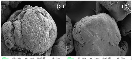 Following ozone treatment, there was still a small amount of microplastics suspended on the surface of the solution. The SEM image in Figure 10 shows that the surface roughness of these unremoved microplastics did not change a lot, thus resulting in their incomplete removal in the O3_coagulation of Al2(SO4)3/PAM. The unremoved microplastics were attributed to its less contact time with ozone, as they floated on the surface of water, and therefore, they were not oxidized by ozone and their surface chemical properties were not altered.