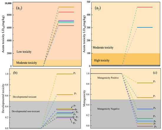 Toxicity analysis of aqueous extracts: mutagenicity of oral LD50 in rat (a1,a2); developmental toxicity (b); lethal concentration (c).