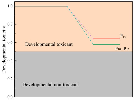 It was confirmed that the transformation of PVC under ozonation includes the breaking of long chains into short chains and the decomposition of the broken chains into a soluble oxygen-containing substance. The toxicity of dissolved species was analyzed, and the results are shown in Figure 11. While dissolved organic matter containing chlorine exhibits developmental toxicity and mutagenicity, non-chlorinated dissolved organic matter is largely non-toxic. The degradation of PVC by ozone reduces the environmental toxicity of its leachates, consequently benefiting aquatic organisms.