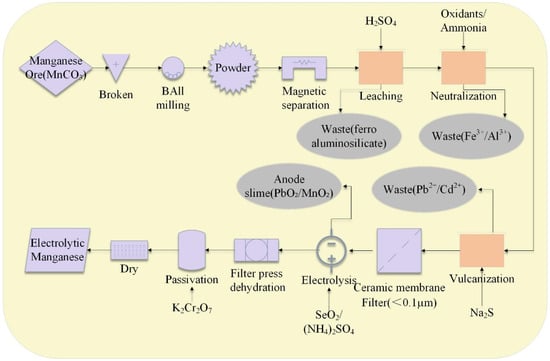 In China’s electrolytic manganese industrial production, most raw materials consist of low-grade manganese ore, primarily MnCO3, typically available in large quantities [10]. Due to the low grade of manganese ore in China, metallic manganese is primarily produced through hydrometallurgical processes, as illustrated in Figure 1. The manganese ore is crushed and ball-milled into powder and enters the magnetic separation system to separate the concentrate. The powder is reacted with sulfuric acid to convert manganese carbonate into manganese sulfate. The acid leaching process produces acid leaching residue containing ferroaluminosilicate. Subsequently, neutralization and sulfidation are carried out to remove impurities. In the neutralization stage, oxidants and ammonia water are added to precipitate Fe3+ and Al3+. In the sulfidation stage, Na2S is added to precipitate Pb2+ and Cd2+. Therefore, the waste manganese residue from these two stages contains corresponding precipitated impurities. The electrolyte is added to the manganese sulfate after impurities are removed to promote cathode manganese precipitation, produce anode mud containing PbO2 and MnO2, and finally obtain the electrolytic manganese product through filter pressing, passivation, and drying.