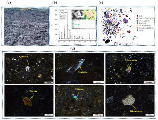Open-air stockpile of EMR (a); X-ray diffraction and energy-dispersive X-ray spectral images of EMR (b); mineral distribution characteristics of EMR (c); and mineral composition of EMR (d) [12].