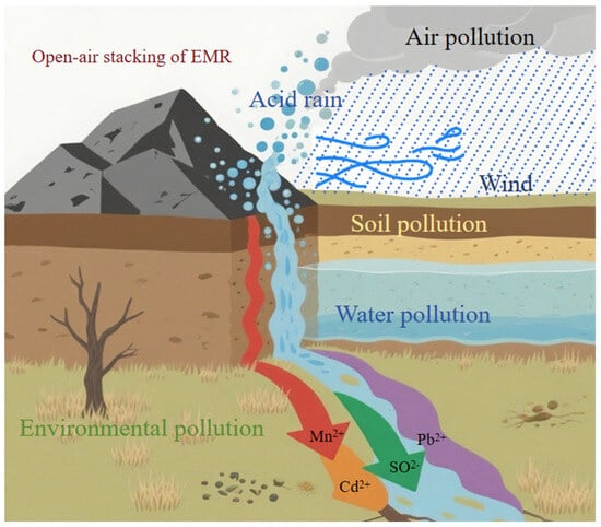 EMR is primarily treated using stacking and landfilling, with the total stockpile in the country exceeding 50 million tons [20]. Figure 3 shows the three-dimensional spread of EMR pollution [21,22]. Stockpiled EMR not only occupies land resources but also releases harmful substances into the soil and water system after long-term weathering and leaching, thereby polluting the surrounding ecosystem 20–22 [23,24,25]. In addition, EMR exhibits acidic properties. Large amounts of stockpiled EMR infiltrate into the surrounding soil through rainwater runoff, causing soil acidification and structural degradation [26,27]. Table 2 presents the toxicity leaching results of EMR as reported in four studies [1]. It is evident that the concentrations of Mn2+ and NH3-N in the leaching solutions of EMR significantly exceed the limits established in the IWDS (GB 8978-1996 [28]). Therefore, during the process of the harmless treatment and resource utilization of EMR, Mn2+ and NH3-N are the critical indicators and focal points of research. The concentrations of its primary pollutants (such as Mn2+ and NH3-N) have surpassed safe thresholds, while the levels of As, Hg, and Se are also elevated at present [29].